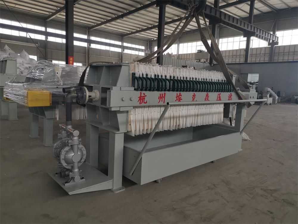 隔膜壓榨壓濾機是由隔膜板和廂式濾板排列組成濾室,在輸料泵的壓力作用下將料漿輸入濾室,通過過濾介質(濾布)將料漿中的固體和液體分離,當料漿中的固體形成餅后,再向隔膜通入空氣,對濾室內的固體充分壓榨。
